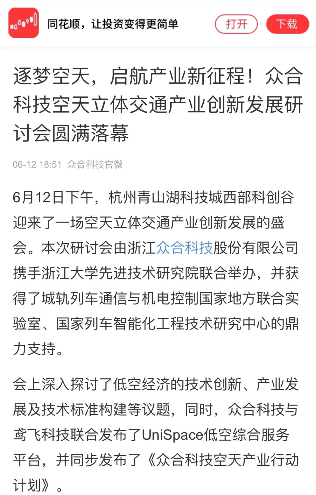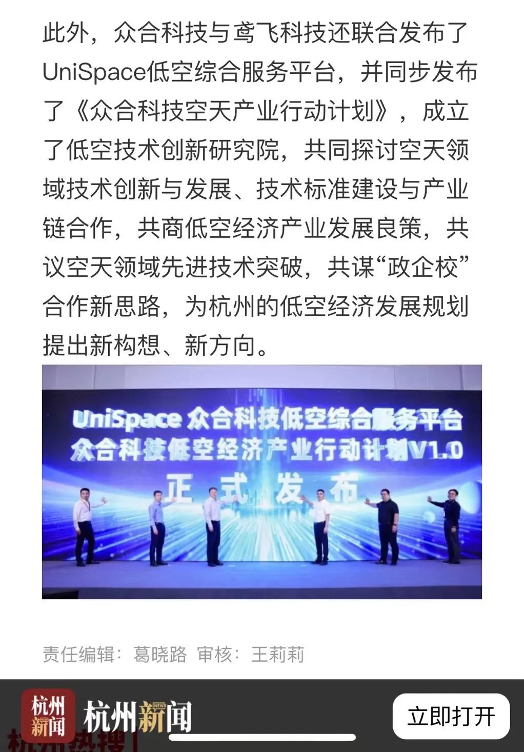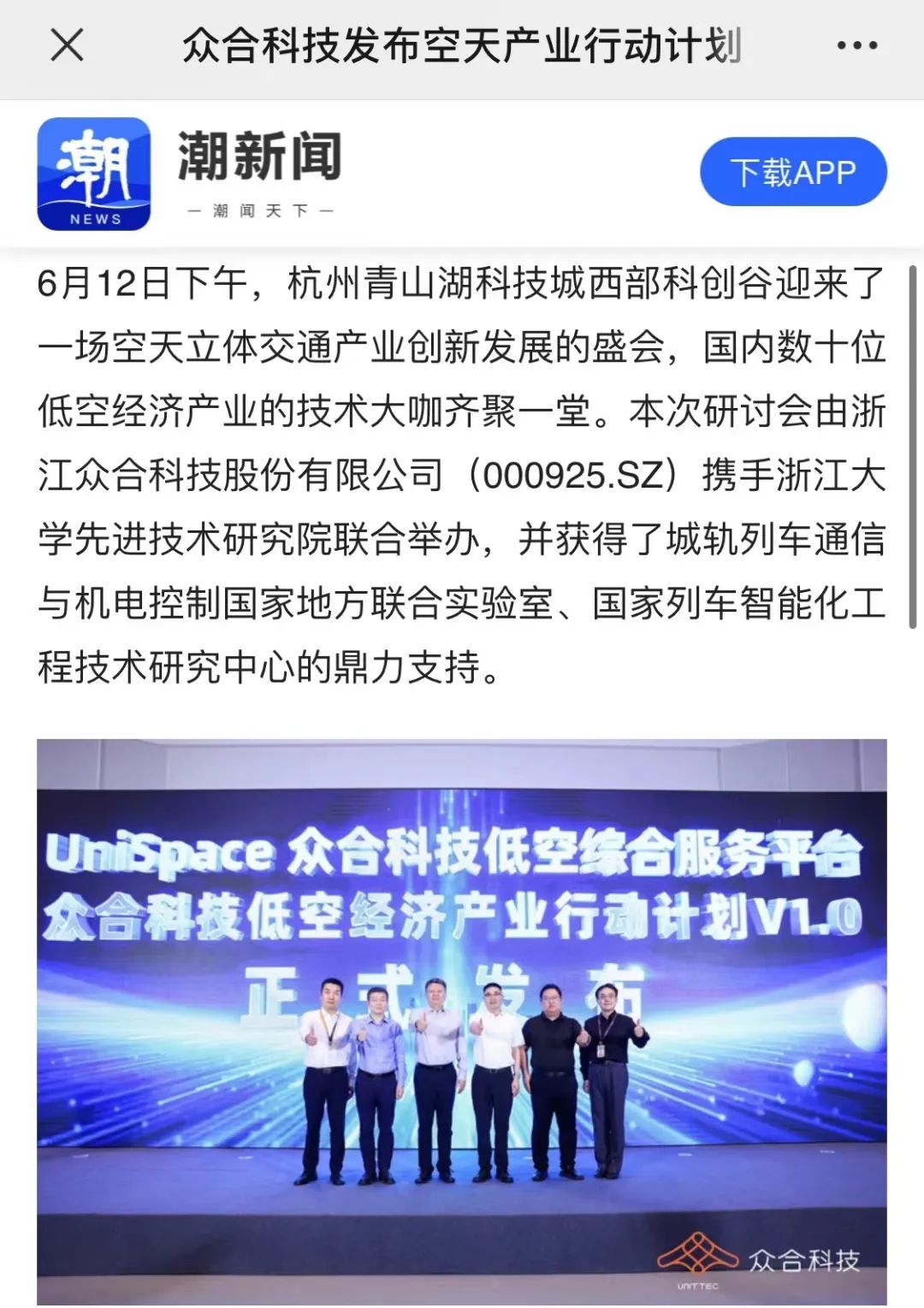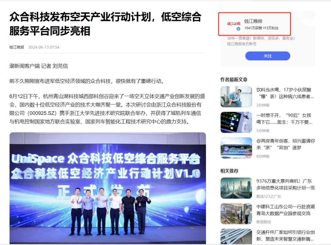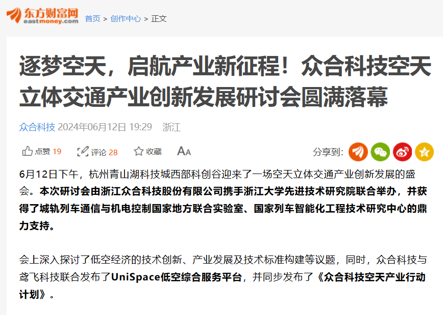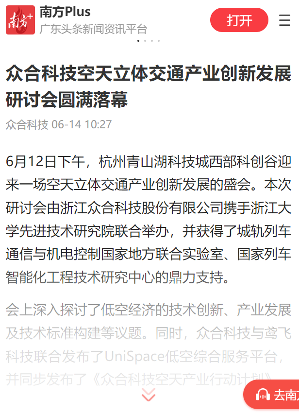 研討會(huì)由浙江眾合科技股份有限公司攜手浙江大學(xué)先進(jìn)技術(shù)研究院聯(lián)合舉辦。會(huì)上,眾合科技與鳶飛科技聯(lián)合發(fā)布了UniSpace低空綜合服務(wù)平臺(tái),并同步發(fā)布了《眾合科技空天產(chǎn)業(yè)行動(dòng)計(jì)劃》,展現(xiàn)了眾合科技致力于構(gòu)建“車路云協(xié)同+低空+低軌衛(wèi)星”的立體交通產(chǎn)業(yè),實(shí)現(xiàn)空地一體、天地互聯(lián)、立體空間的協(xié)同發(fā)展的堅(jiān)定決心。