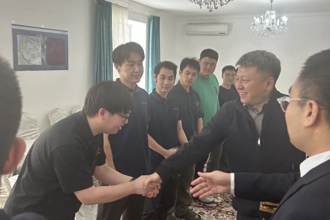 邊勁飛一行還深入員工宿舍與施工現(xiàn)場,親切慰問項(xiàng)目成員,細(xì)致詢問大家的工作生活狀況、后勤保障及實(shí)際困難?!按蠹疫h(yuǎn)離故土,春節(jié)期間仍在嚴(yán)寒中辛勤付出、默默奉獻(xiàn),全力保障后續(xù)工期節(jié)點(diǎn),公司永遠(yuǎn)是大家最堅(jiān)實(shí)的后盾!”邊勁飛溫暖的話語鼓舞著每一位項(xiàng)目成員。他叮囑項(xiàng)目管理團(tuán)隊(duì)務(wù)必做好員工關(guān)懷與后勤保障,嚴(yán)格落實(shí)安全生產(chǎn),尊重當(dāng)?shù)匚幕?,促進(jìn)中外團(tuán)隊(duì)融合,營造和諧穩(wěn)定的工作生活環(huán)境。項(xiàng)目成員紛紛表示,感謝公司的牽掛與關(guān)懷,必將這份溫暖轉(zhuǎn)化為前進(jìn)動(dòng)力,確保項(xiàng)目如期開通。